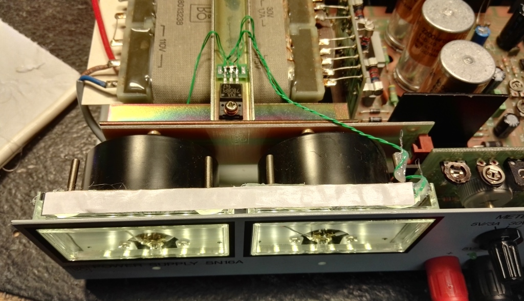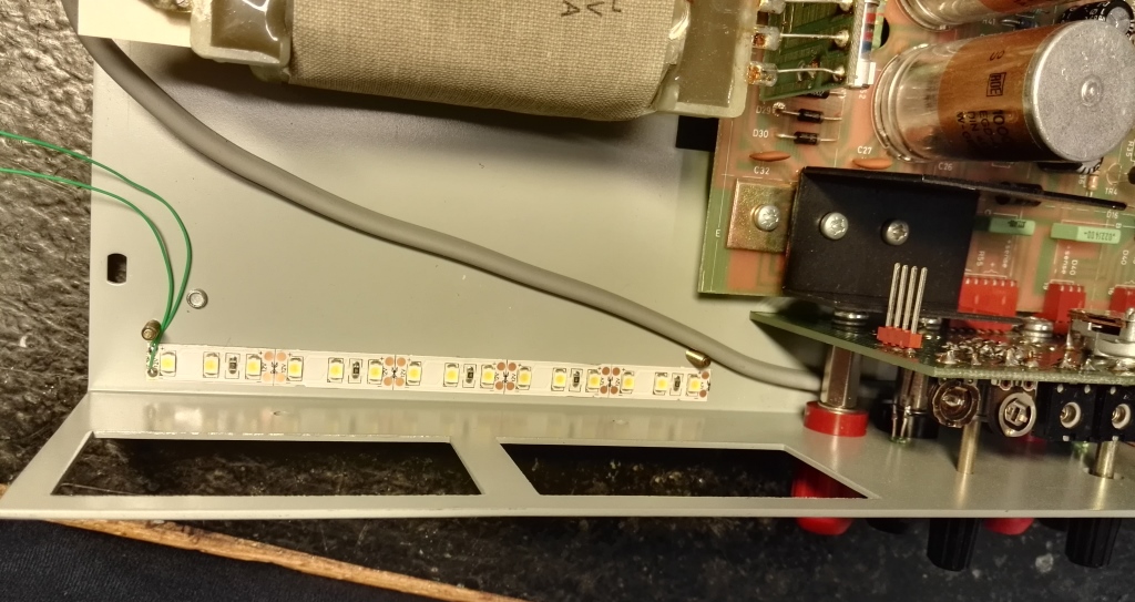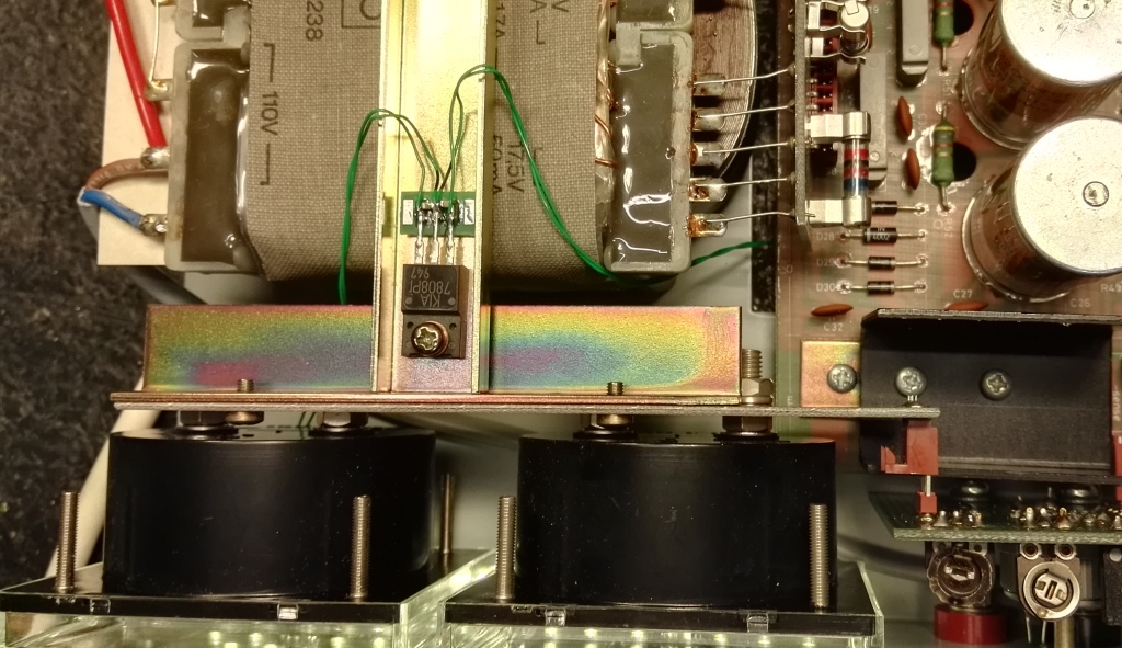 a 12V LED band is way to bright if feed with 12V, so here i used a neat 8V regulator, its input of the 7808 is connected to the low voltage supply main capacitor.