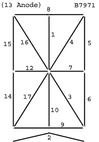 The two anodes (pin 13 on B7971 socket) goes via 8k2 to the two first Anode driver outputs