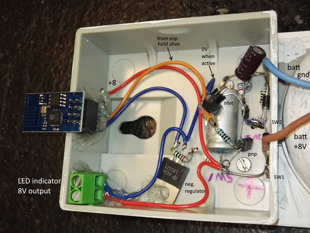 The reason for this is simple, the PNP transistor and its keep alive signal from the esp works from +