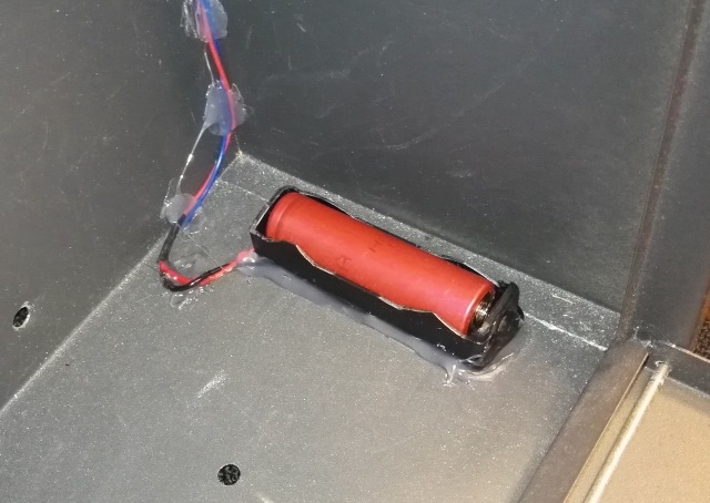 battery holder for one large li-ion cell, is mounted at the bottom, where it is most easy to access