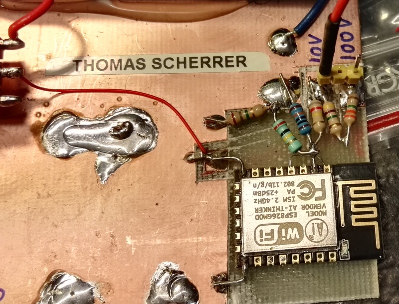 close up resistors esp8266 module, also see the removed copper, better for longest radio range not to have metal near the antenna,
