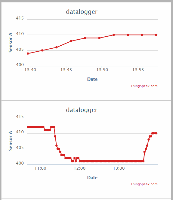 #include Arduino.h //(just add <> arround all the 4 h files, for no compile errors) #include ESP8266WiFi.h #include ESP8266WiFiMulti.h #include ESP8266HTTPClient.h ESP8266WiFiMulti WiFiMulti; #define INTERVAL 60000 void setup() { pinMode(5, OUTPUT); //Serial.begin(115200); // uncomment for debugging for (uint8_t t = 4; t > 0; t--) { //Serial.println("Connect..."); delay(1000); } WiFiMulti.addAP("wifiname1", "wifipassword1"); // add as many known locations as needed WiFiMulti.addAP("wifiname2", "wifipassword2"); // maybe even your phone id in shared wifi mode WiFiMulti.addAP("wifiname3", "wifipassword3"); // this way it also work anywhere you might want to bring it WiFiMulti.addAP("wifiname4", "wifipassword4"); delay(1000); } // Time to sleep (in seconds): const int sleepTimeS = 120; // adjust the wanted update interval here, 120 = 2 minutes. void loop() { delay(100); if (WiFiMulti.run() == WL_CONNECTED) { digitalWrite(5, HIGH); HTTPClient http; String URL = "http://api.thingspeak.com/update?api_key=YOUR_UPDATE_KEY_HERE&field1="; // field is the curve number URL += (String)analogRead(A0); // here is ADC value is added as text to the URL. http.begin(URL); //HTTP int httpCode = http.GET(); if (httpCode > 0) { // file found at server if (httpCode == HTTP_CODE_OK) { String payload = http.getString(); } } else { } http.end(); digitalWrite(5, LOW); // Serial.println("wifi-data-send"); delay(100); ESP.deepSleep(sleepTimeS * 1000000); }// wifi } // main loop