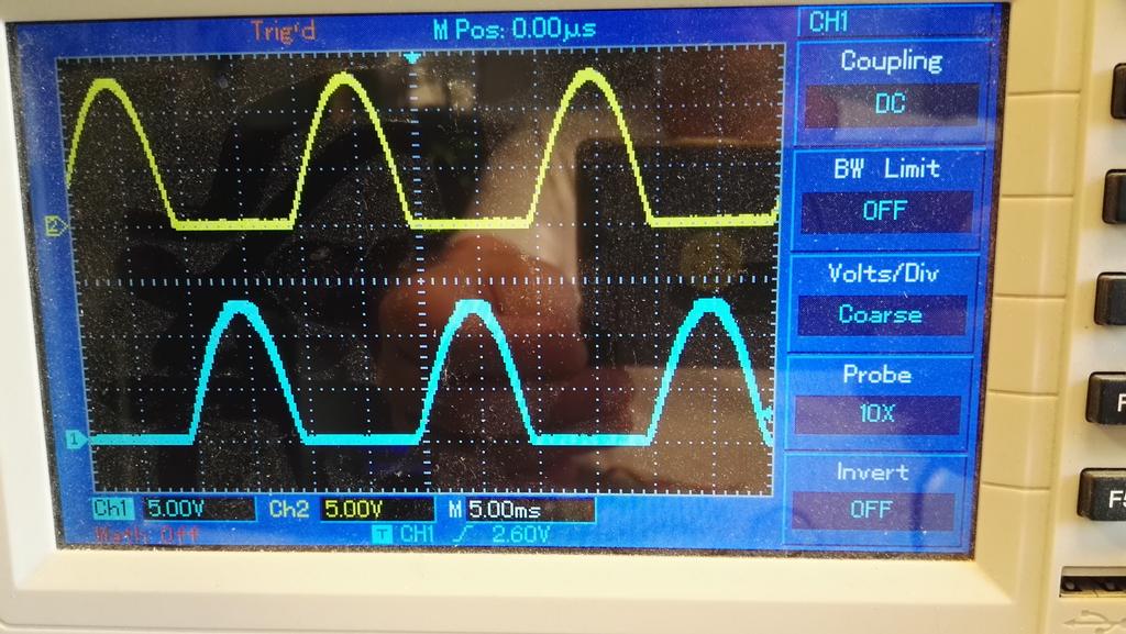 Both outputs paralleled using seperate lowpass filters, and seperate "primary" windings on mains step up transformator