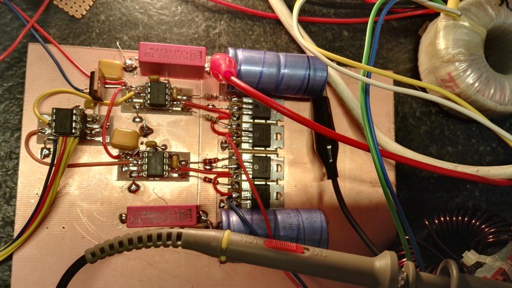 close up of FET drivers. Circuit actually works, however fet gatecharge is a problem if large fets are used