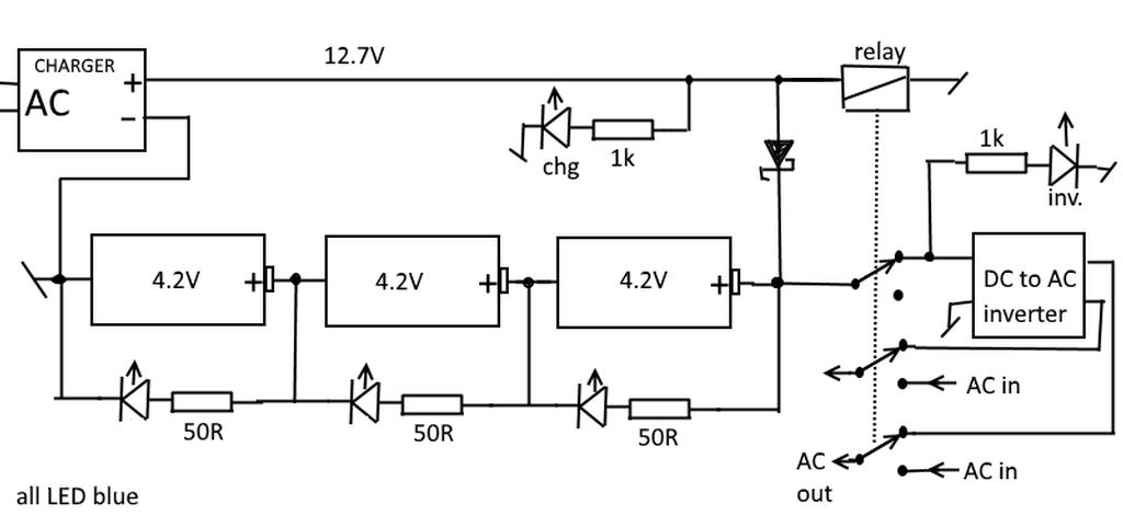 Main circuit idea, note the LED and resistors in parallel with the 3 cells, are for cell voltage balance