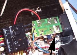 Cut the connection to the output connector. The white line is the cut away copper track.