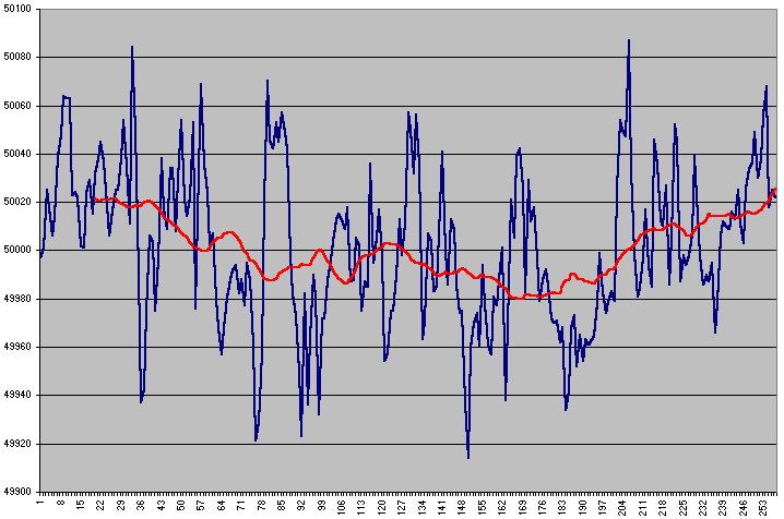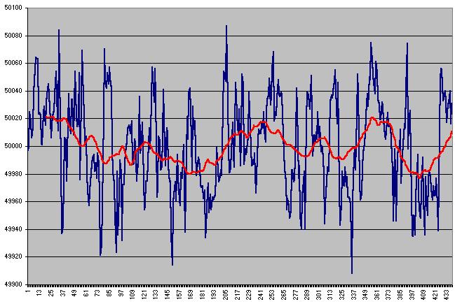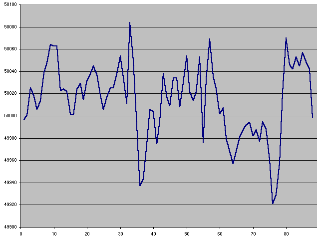 Her er 24 timers målinger. Middel værdi af 88 målinger er = 50.01423864 Hz