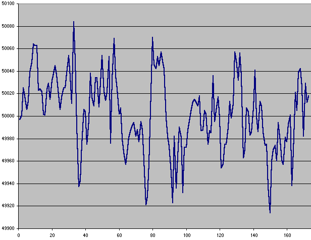Frekvensen ligger i hovedreglen inden for 49.95 og 50.05 Hz