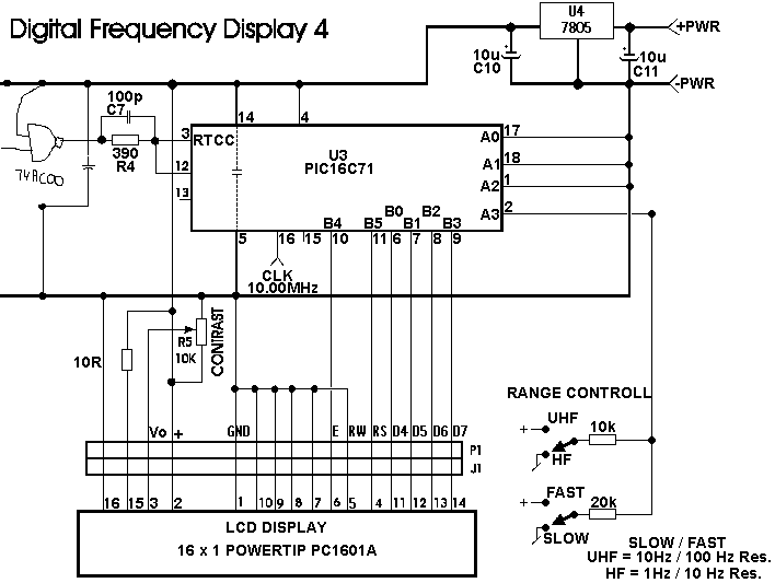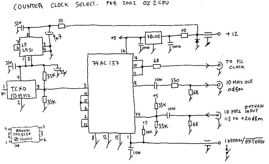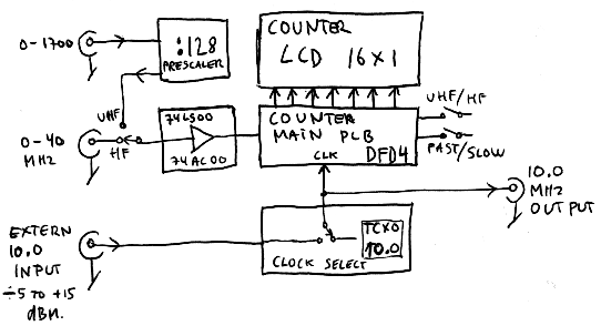 The DFD4 schematic. Modified to benchtop counter, with external clock input.