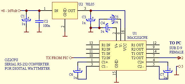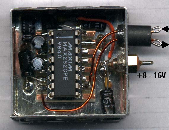 Her ses MAX232 monteret i en lille fortinnet blik kasse.