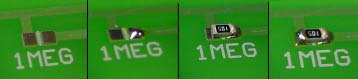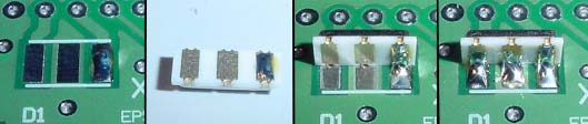 med loddekolben der har en fin spids, varmes den fortinnede ø op, imens SMD komponenten placeres helt lige,