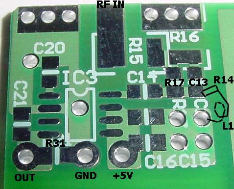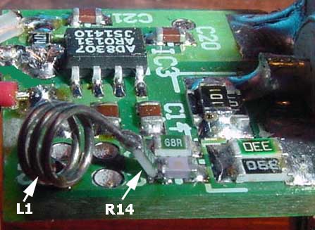 Det er vigtigt at lodde L1 fast på ground planen først, inden den loddes fast på toppen af R14, ellers kan denne modstand let knække.