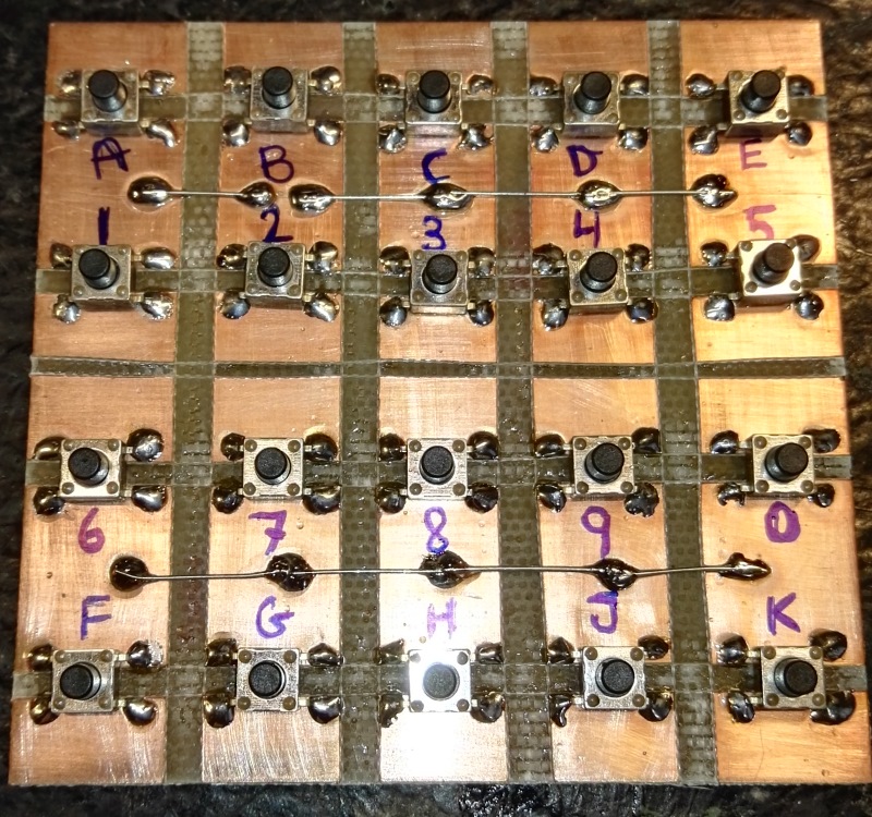 only 4 analog inputs are needed to read all the 20 buttons, each button on a 5 row, deliver 1-2-3-4-5 Volts when pressed,